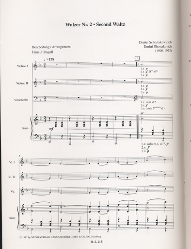 Shostakovich, Dmitri: Second Waltz from Jazz Suite #2 (Piano, 2 Violins, Cello)