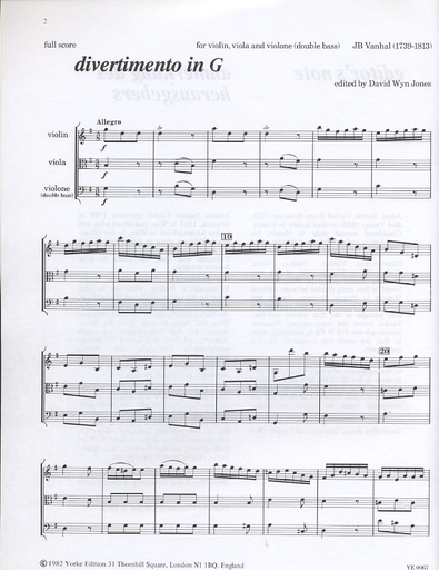 Vanhal: Divertimento in G (violin, Viola, Bass) score & parts