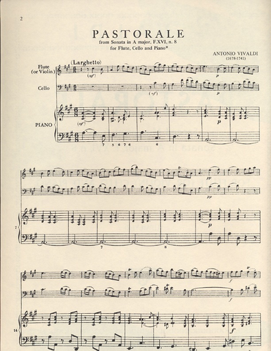 Vivaldi, Antonio: Pastorale Second movement from Sonata in A major, F. XVI, n. 8 (flute or violin, cello, piano)