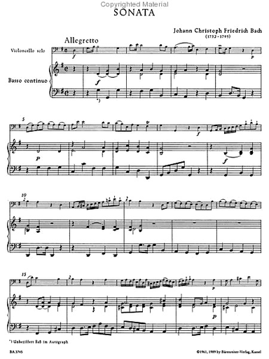 Bach, J.C.F.: Sonata for Cello in G major (cello & bass continuo) Barenreiter