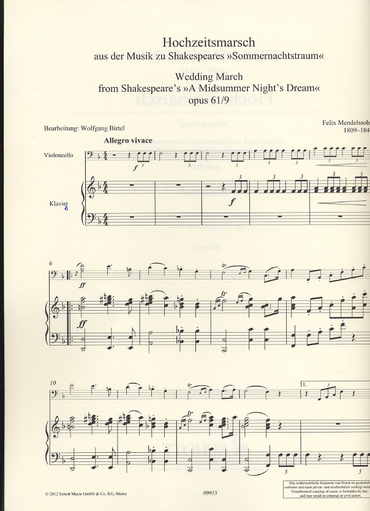 Mendelssohn, Felix: Wedding March from Shakespeare's ''A Midsummer Night's Dream'' Op. 61 No. 9 (cello & piano)