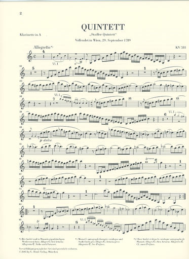 Mozart, W.A. (Wiese): Clarinet Quintet in A, K.581and Fragment K.Anh. 91 (516c), urtext (clarinet, 2 violins, viola, and cello)