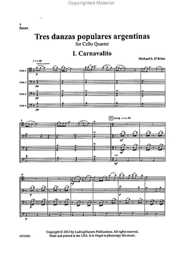 O'Brien: (score/parts) Tres Danzas Populares Argentinas (cello quartet) Latham Music