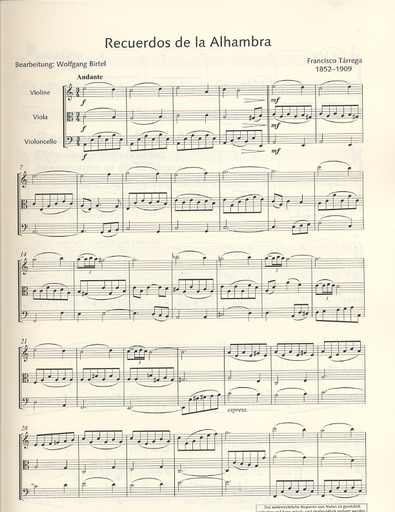 Tarrega, F (Birtel).: Recuerdos de la Alhambra (violin, viola, cello) score & parts