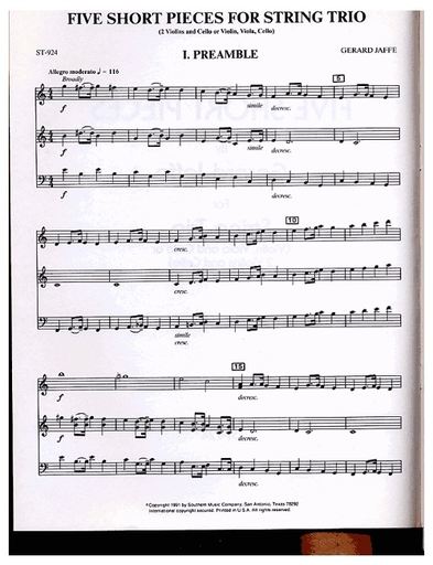 Jaffe, Gerard: 5 Short Pieces for String Trio (violin, Viola, Cello) (2 violins, Cello) Out of Print