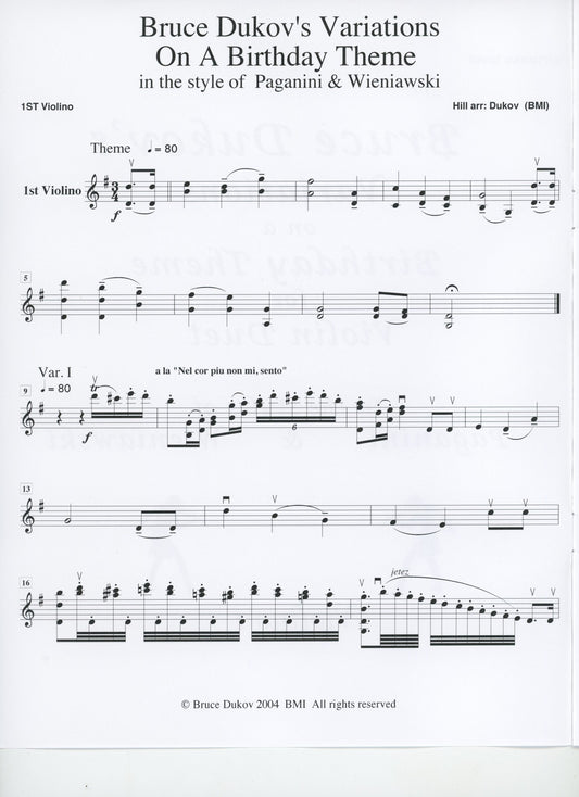 Dukov, Bruce: Variations on a Birthday Theme, violin duet, Virtuoso level, sheet music