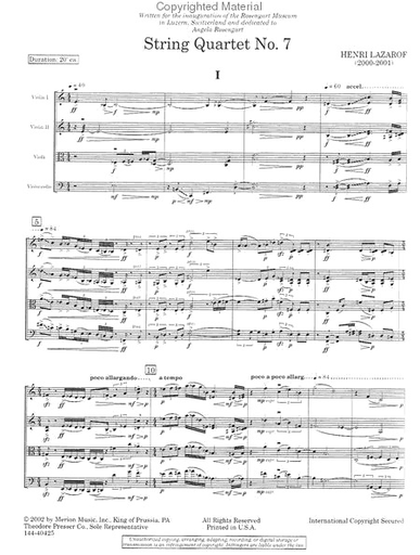 Lazarof, Henri: String Quartet No. 7, score and parts