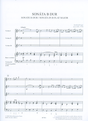 Finger, Gottfried: Sonata in Bb Major for 3 Violins and basso continuo, score & parts, Barenreiter