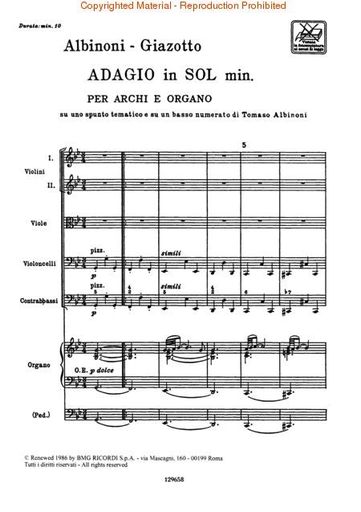 Albinoni, T.: (Score) Adagio in G minor (string orchestra, and organ)
