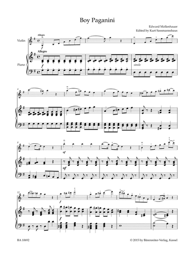 Mollenhauer, E. (Sassmannshaus): The Boy Paganini (violin & piano) Barenreiter