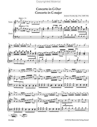 Vivaldi, Antonio (Sassmannshaus): Concerto in G major Op. 3 Nr.3 (RV 310) (violin & piano) Barenreiter