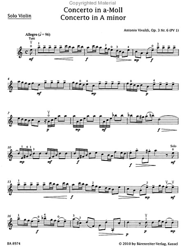 Vivaldi, Antonio (Sassmannshaus): Concerto in a minor Op.3 No.6 (violin & piano) Barenreiter