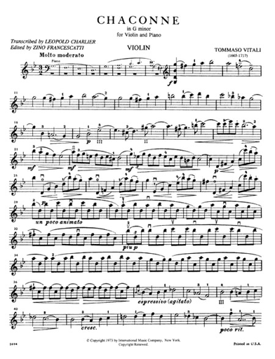 Vitali, T. (Francescatti): Chaconne (Ciaccona), (Ciacona), in G minor (violin & piano) IMC