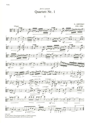 Arensky, Anton: String Quartet No. 1 Op.11 (2 violins, viola, cello) set of parts