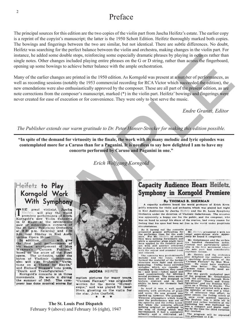 This new edition of the violin solo part to the Korngold Violin Concerto in D Major is the first-ever to include Jascha Heifetz's performance notations, edited by Endre Granat, one of his star proteges. Born in Austria, Korngold was forced into US exile by the annexation of Austria by the Nazis. He vowed to give up composing anything other than film music until Hitler was defeated. With the end of World War II, he retired from films to concentrate on music for the concert hall. The violin concerto was the first such work that Korngold wrote following some initial persuasion from violinist and fellow émigré Bronislaw Huberman. Korngold was hurt by the assumption that he had sold his integrity to Hollywood. He was thus determined to prove himself with a work that combined vitality and superb craftsmanship. Korngold composed his Violin Concerto in D major, Op.35, in 1945, dedicating it to Alma Mahler, the widow of his childhood mentor, Gustav Mahler. The work was premiered on February, 15 1947 by Jascha Heifetz and the St. Louis Symphony under conductor Vladimir Golschmann. It received the most enthusiastic ovation in St. Louis concert history at the time. On March 30, 1947, Heifetz played the concerto in Carnegie Hall with the New York Philharmonic conducted by Efrem Kurtz; the broadcast performance was recorded on transcription discs. Heifetz's performance launched the work into the standard repertoire, and it quickly became Korngold's most popular piece. Concerning Heifetz's performance of the work, the composer wrote,