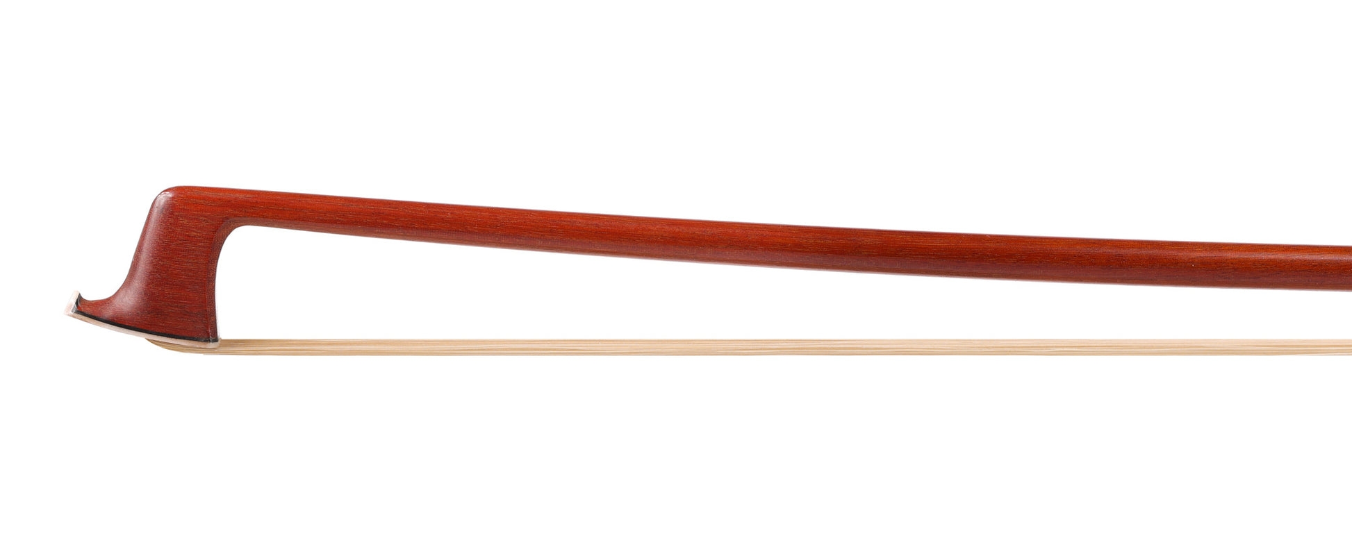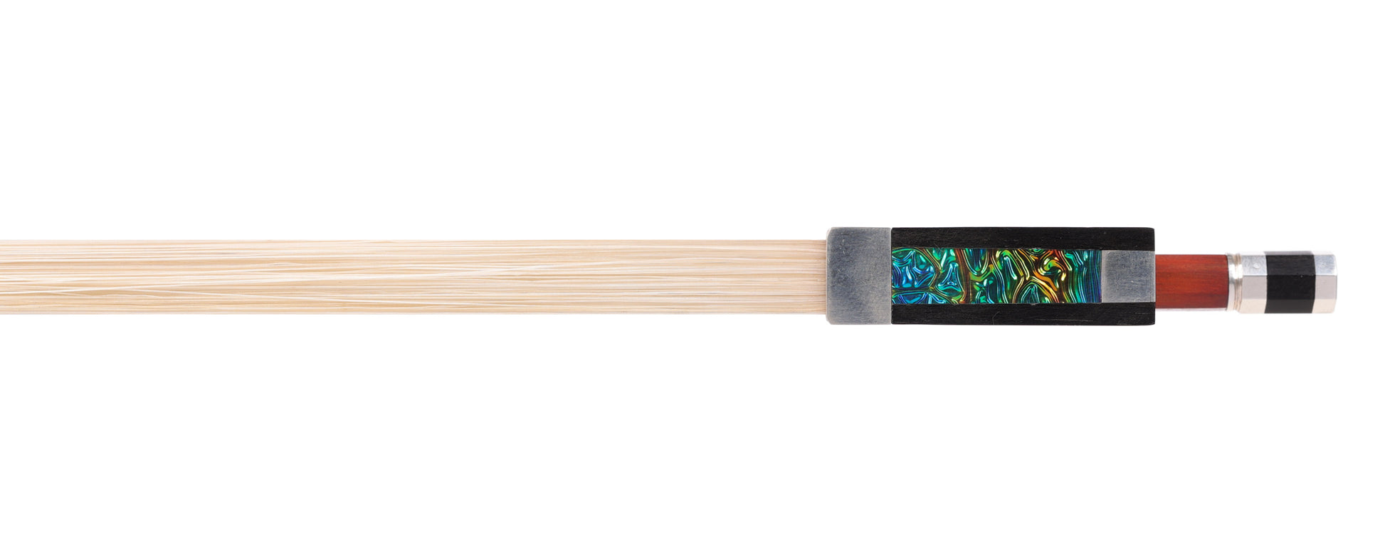 DAVID RUSSELL YOUNG violin bow, round Pernambuco stick with silver-mounted ebony frog with green Dichrolam pearl, 60.9 grams, Colorado, USA