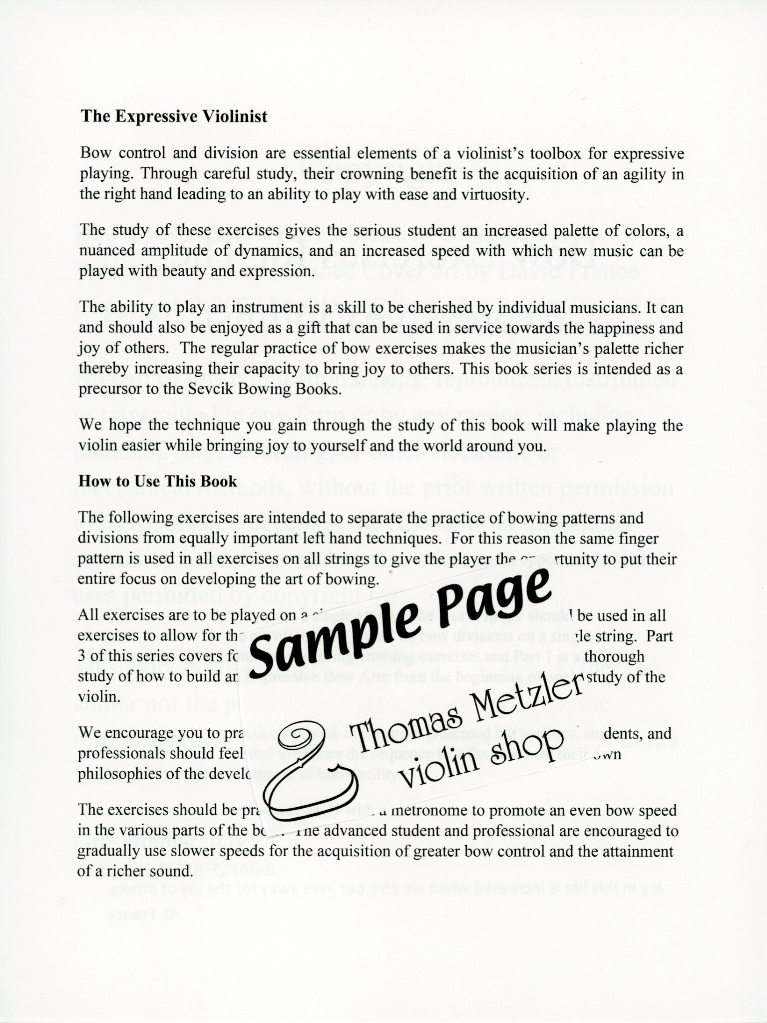 Bow Exercises for the Expressive Violinist is a series of fundamental bow studies allowing the player to acquire agility in the right hand, an even tone in all parts of the bow, and an ability to play with ease and virtuosity. The study of these exercises gives the serious student an increased palette of colors, a nuanced amplitude of dynamics, and an increased speed with which new music can be played with beauty and expression. The regular practice of bow exercises makes the musician's palette richer thereby increasing their capacity to bring joy to others. This book series is intended as a precursor to the Sevcik Bowing Books.