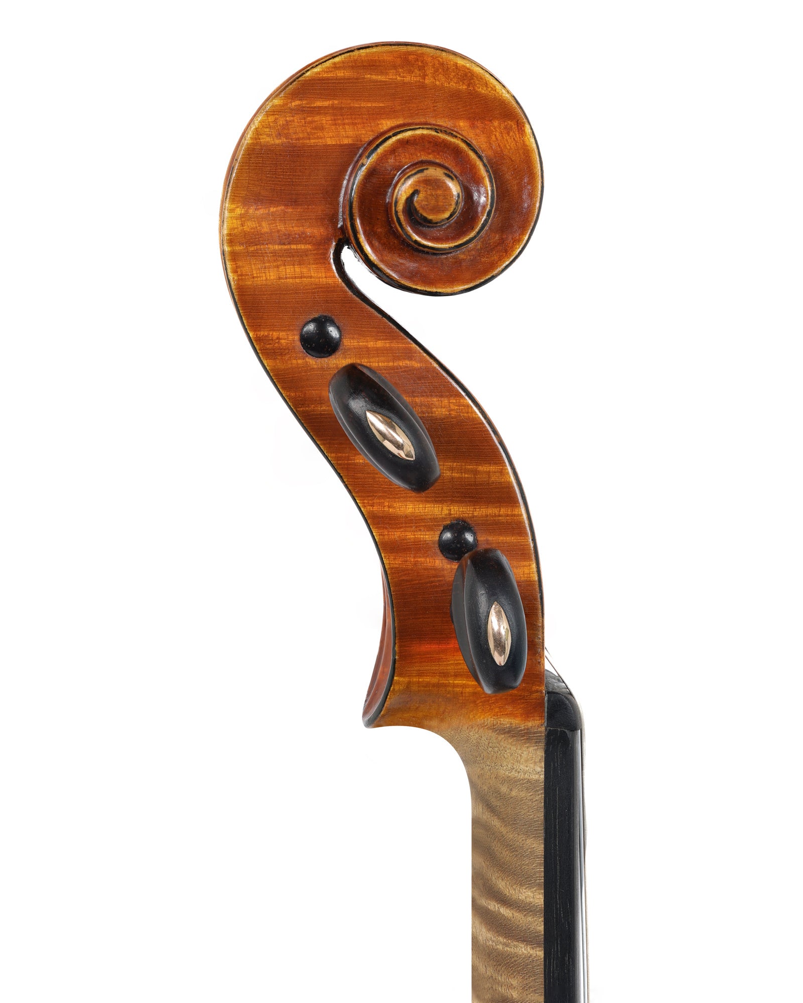 This violin has a mature, open sound and is even across all registers. This versatile violin would be a fantastic instrument for orchestral and chamber playing. It has a dark, reddish-brown top and a bright, two piece back with beautiful flame. The scroll has delicately blackened chamfers. This violin is in excellent condition.