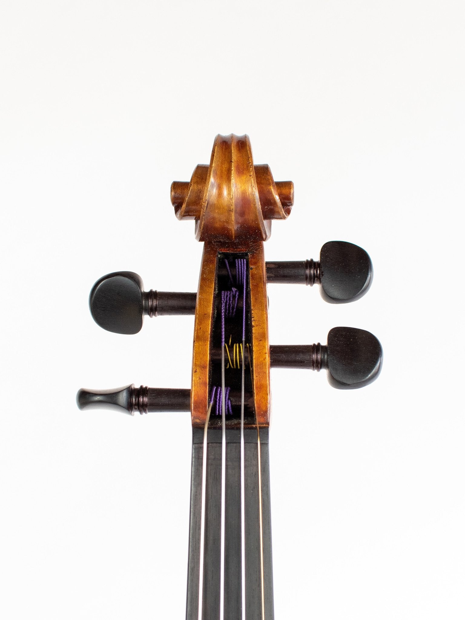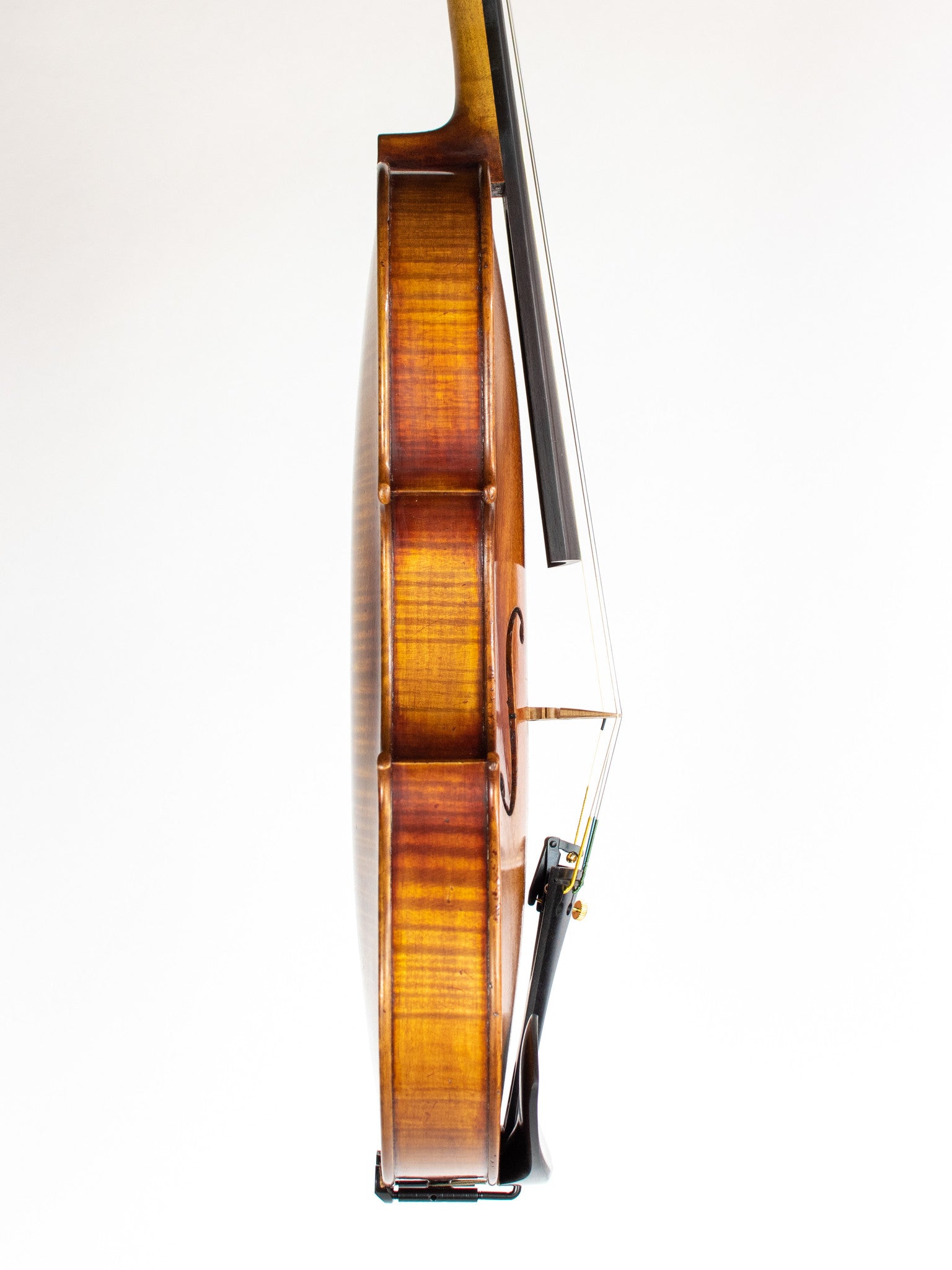 The Giulia features a vintage aesthetic, from the tasteful antiquing on its warm, dark brown varnish, all the way to its Art Deco style interior label, by local LA designer, Mike Kelley. Giulia violins are set up with ebony pegs, tailpiece, and chinrest, and Thomastik-Infeld strings.