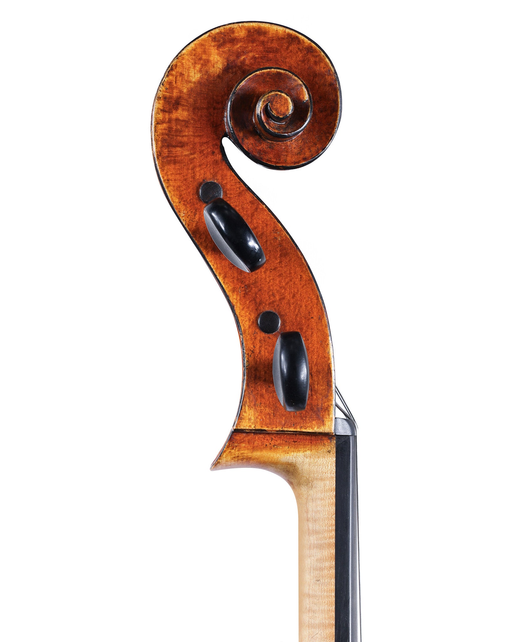 The back is formed from a single piece of willow and is marked with various small pin knots and other irregularities and a ‘cut off marching pin’ located in the center between the upper corners. The willow wood of the sides is similar to that of the back while the head is of beech wood and has been grafted to the maple neck. The table is spruce with medium grain in the center becoming broader at the flanks. The varnish is a burnt-orange-brown color over an almond ground and has been slightly worn back and antiqued in simulation of age. The instrument was made on the pattern of Giuseppe Guarneri fillies Andrea and worked vigorously in the manner of Giuseppe del Gesu circa 1735. This instrument is in an excellent condition.”