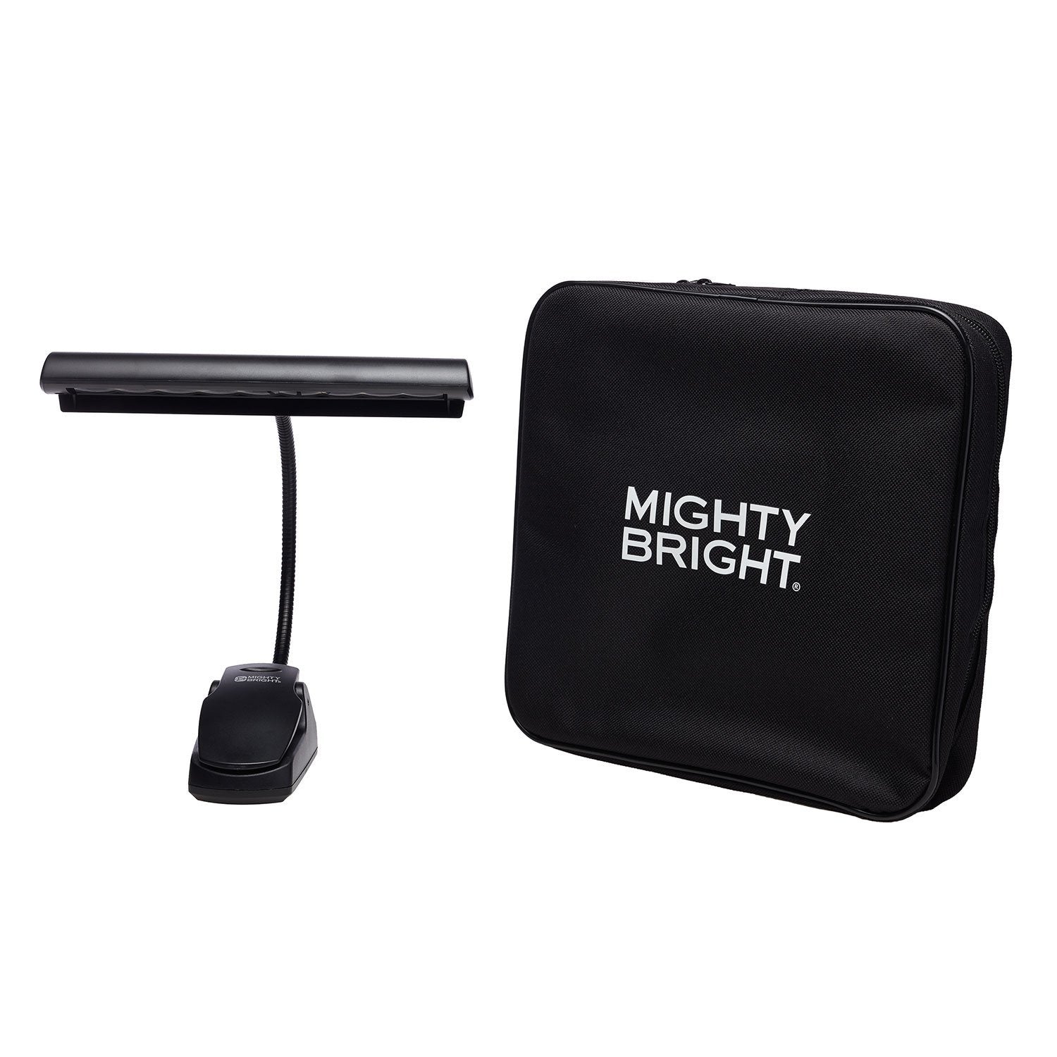 Mighty Bright Orchestra Light features 9 bright white LED's rated for 100,000 hours, capable of lighting 4 full pages of sheet music. Specifically designed to be discreet, its built in back fin directs light away from the audience. It has a sliding power switch with two brightness levels and its cushioned extra-strong clip provides a secure grip on music stands. Powered by (3) AA batteries (included) with a battery life of 14 hours, or by AC power adapter (included). Includes a durable travel case as well.