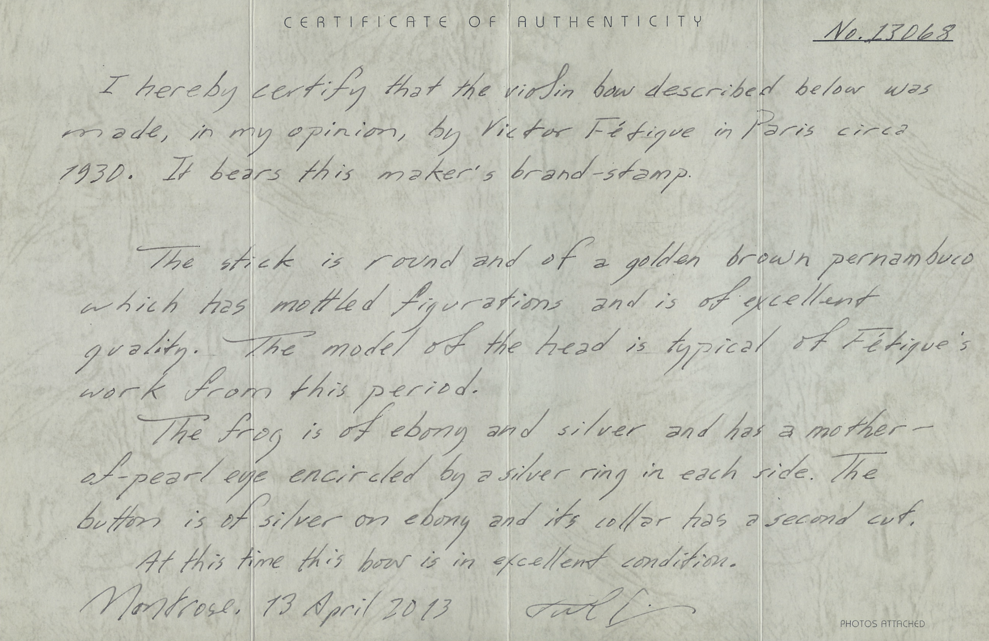 Victor Fetique violin bow, ca. 1930, silver-mounted round stick, w/ Paul Childs Certificate