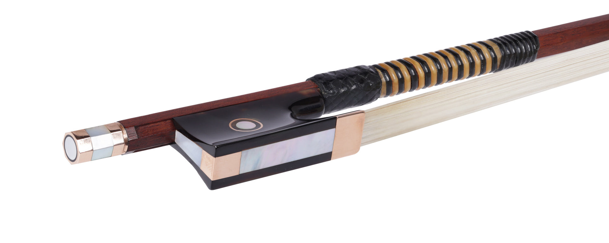 This uncirculated violin bow, made by Arthur Copley for W.E. Hill & Sons in London in 1957, represents the ultimate of English bow making and decorative beauty, including the polished tortoise-shell frog, gold Parisian eyes, gold fittings, whale-bone grip and beautiful octagonal Pernambuco stick. This is a true collector's bow, and even still has the original 1957 hair. A new rehair is offered with the sale, but some collectors may wish to have the bow left in the absolute original condition with original hair. The weight is 61.6 grams. Because this bow has components made from tortoise-shell and whale baleen, this bow cannot be carried or shipped outside of the United States. The purchaser of this bow should never travel internationally with this bow for fear of confiscation at any number of customs checkpoints. hillcollection